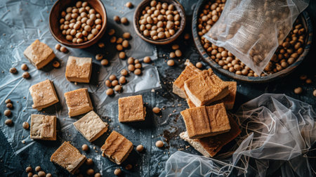 Organic Tofu with Soybean - A rustic shot of homemade tofu beside whole soybeans and a cheesecloth, highlighting its natural origins. Grainy texture, warm earthy tones.