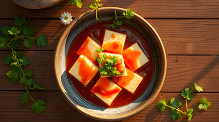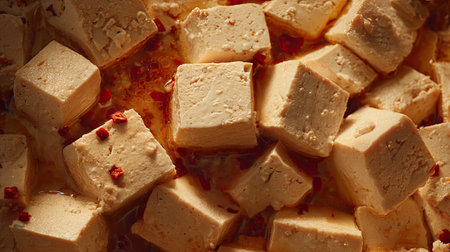 Close-up of soft tofu cubes immersed in a spicy sauce, garnished with chili flakes, presenting a masterpiece of Asian cuisine ideal for culinary delights.