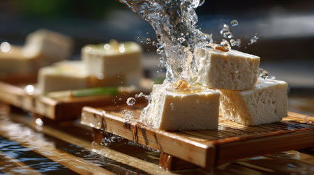 A stunning image of fresh tofu blocks on a bamboo tray, highlighted by a water splash, showcasing culinary artistry in a natural setting.