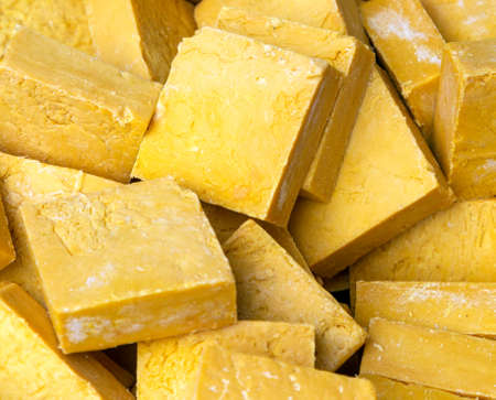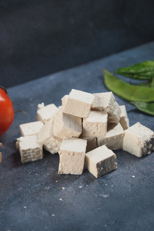 Tofu in cubes - vegetarian food made with soya seeds - closeup
