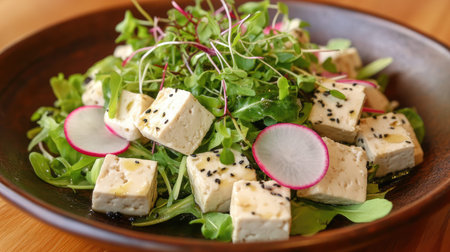 A vibrant and fresh salad featuring cubes of tofu, thinly sliced radish, and a mix of microgreens drizzled with sesame. Perfect for healthy dining.