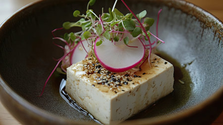 A visually appealing tofu dish garnished with fresh microgreens and slices of radish, served in a beautifully textured bowl. Perfect for healthy eating.