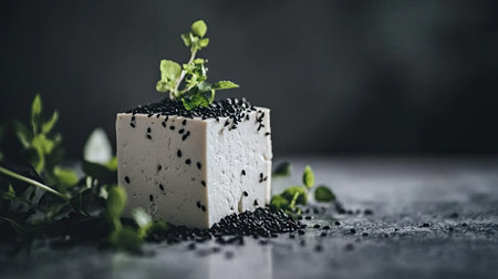 This image captures a fresh white cheese block topped with black seeds and green herbs, emphasizing natural colors and textures ideal for culinary presentations.