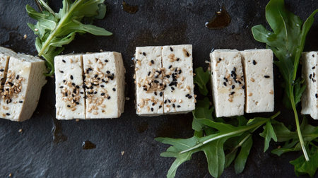 This image features freshly cut tofu sprinkled with sesame seeds, accompanied by vibrant arugula, elegantly presented on a dark stone background, ideal for culinary projects.