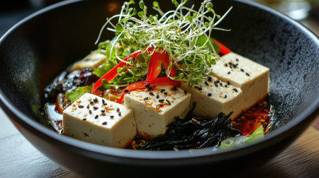 A beautiful presentation of silken tofu cubes topped with fresh sprouts and served in a savory dipping sauce, showcasing the essence of healthy Asian cuisine.