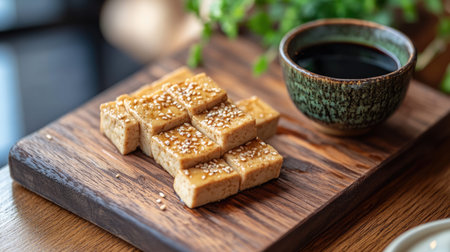 Indulge in a delightful traditional Asian snack of sweet sesame cubes, beautifully presented on a wooden board with a rich dipping sauce.