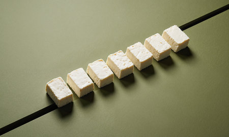 Greek Feta Line - feta cubes aligned diagonally on olive green background, minimal Mediterranean geometry.