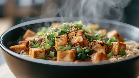 A steaming bowl of fresh tofu accompanied by vibrant vegetables showcases the essence of healthy Asian cuisine. Perfect for culinary enthusiasts!