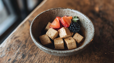 A small bowl of almond tofu cubes with a hint of syrup, placed on a rustic wooden table. Fresh fruit slices are arranged artistically on top. --chaos