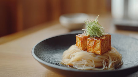 Explore an elegant dish featuring tofu and noodles, beautifully presented in a modern style. Perfect for showcasing Asian culinary art and flavor.