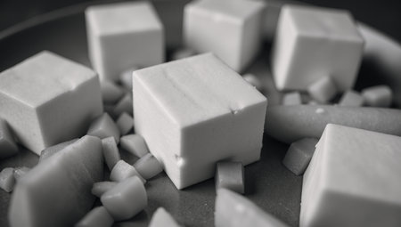 Neatly arranged cubes of freshly cut tofu sit on a wooden tray, showcasing a minimalist and elegant food presentation perfect for any culinary project.