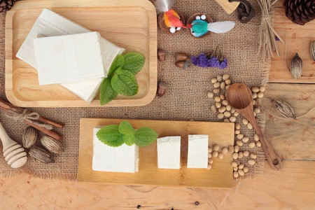 Tofu and soybeans on wood background