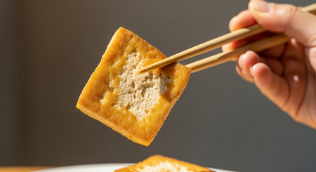 Sliced tofu on white dish eating by chopsticks, Healthy vegan food