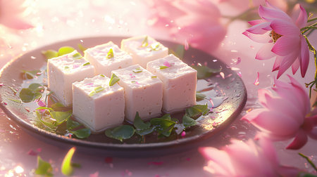 A delicate arrangement of tofu cubes on a plate, surrounded by blooming pink lotus flowers and soft green leaves on a pastel background.