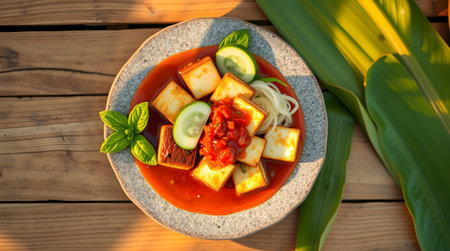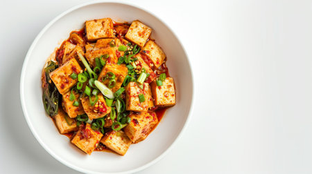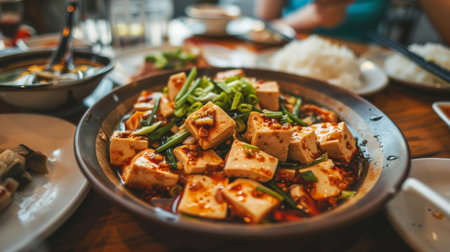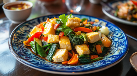 This vibrant Asian dish features cubes of tofu complemented by fresh vegetables and a spicy sauce, perfect for a nutritious and appetizing meal.
