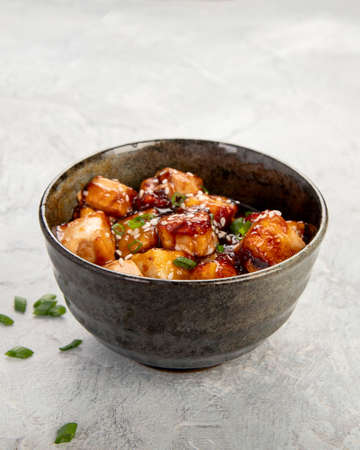 Tofu in teriyaki sauce with green onions, chili peppers and sesame. Asian food. Vegetarian food. healthy eating