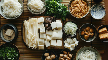 Discover an arrangement of fresh ingredients for traditional Japanese Shabu Shabu, featuring various vegetables, noodles, and meats, perfect for communal dining experience.