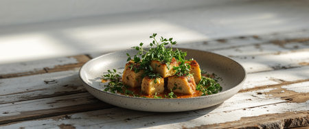 A visually appealing tofu dish garnished with fresh microgreens and slices of radish, served in a beautifully textured bowl. Perfect for healthy eating.