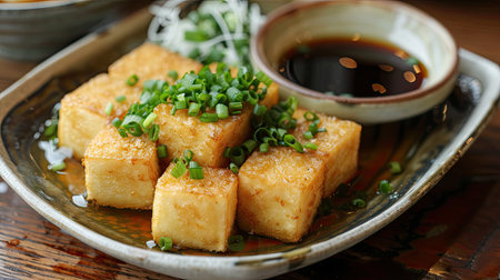 Fried Tofu with soy sauce and spring onion on a plate