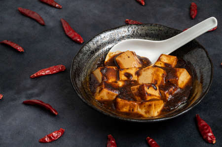Material of traditional chinese food,spicy Mapo Tofu decorates with chilis and hot peppers on black background.