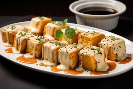 fried tofu with white sesame and teriyaki sauce - vegan and vegetarian food style