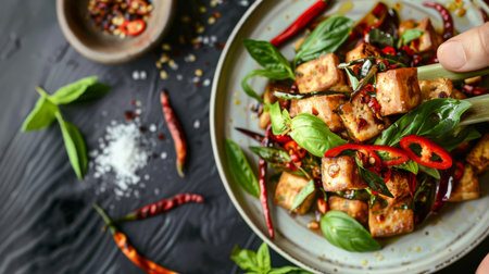A vibrant and appetizing plate of spicy tofu stir-fry featuring crispy golden cubes of tofu, garnished with fresh herbs and dried chilies, set against a rustic backdrop.
