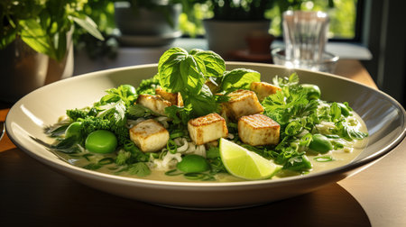 freshly made tofu garnished with herbs on a plate, created with generative ai