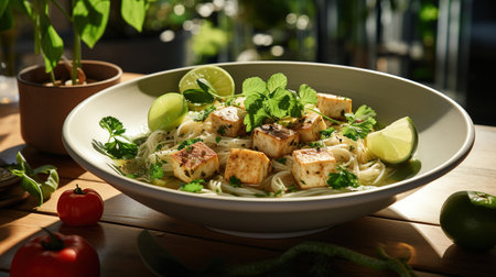 homemade tofu, soy sauce, and fresh herbs on a plate, created with generative ai