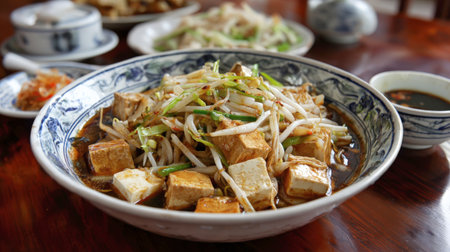 Traditional Chinese Tofu Dish: Cubes of Tofu Served in a Rich, Dark Sauce and Topped with Fresh Bean Sprouts and Scallions in an Ornate Blue and White Bowl on a Wooden Table.