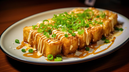 AI Generated. Fresh Tofu Dish with Green Onions and Soy Sauce Glaze Served on a Gray Plate in Natural Light