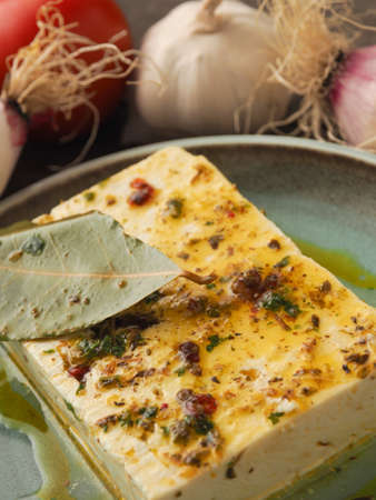 Organic feta cheese with herbs and olive oil on a rustic plate, healthy food