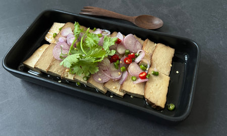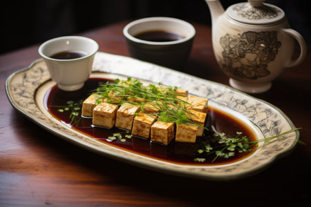 homemade tofu, soy sauce, and fresh herbs on a plate, created with generative ai