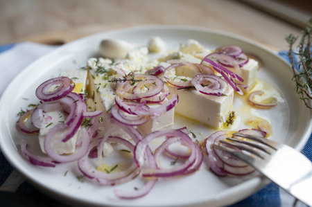 Feta cheese salad with olive oil, red onions and thyme