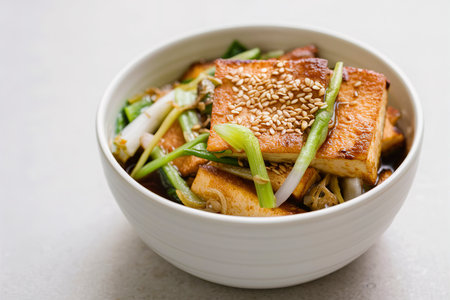 Enjoy a vibrant plate of stir-fried tofu and green onion showcasing delightful textures and savory flavors, perfect for a nutritious meal or plant-based delight.