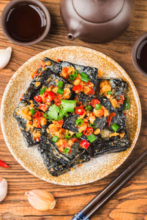 Top view spicy black tofu salad isolated on black background.