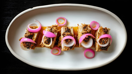 Modern culinary presentation of traditional Yucatecan Cochinita Pibil. Slow-roasted pulled pork portions arranged on a white oval platter, garnished with vibrant pickled red onion rings.