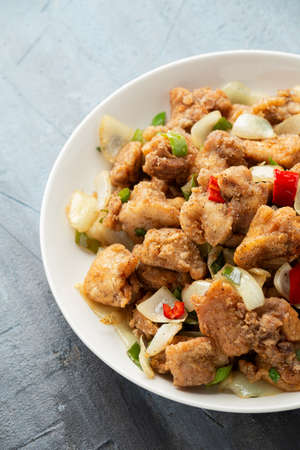 Stir fry chinese salt and pepper chicken with red, green chilli, onion, spring onion in white bowl.