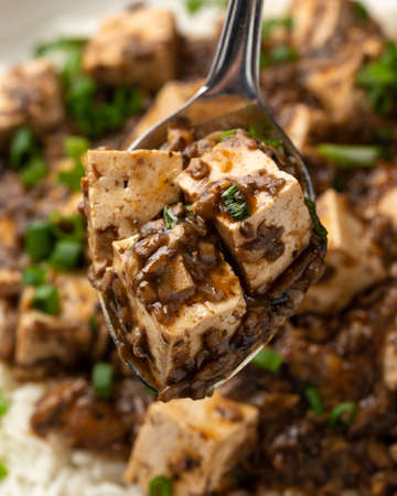Vegan Mapo tofu with mushroom and rice. Asian, Chinese food