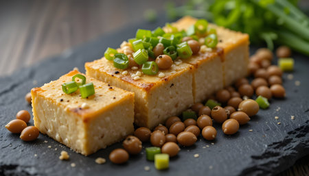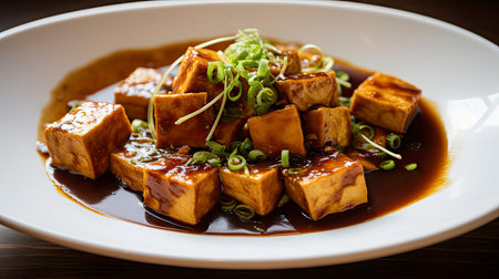 AI Generated. Fresh Tofu Dish with Green Onions and Soy Sauce Glaze Served on a Gray Plate in Natural Light