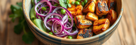 Grilled paneer salad with red onion and green peas served in a bowl for a fresh lunch