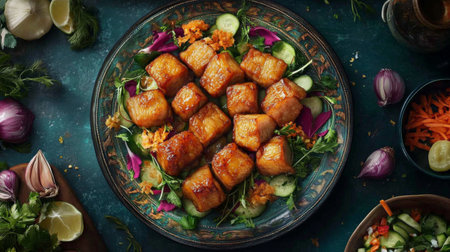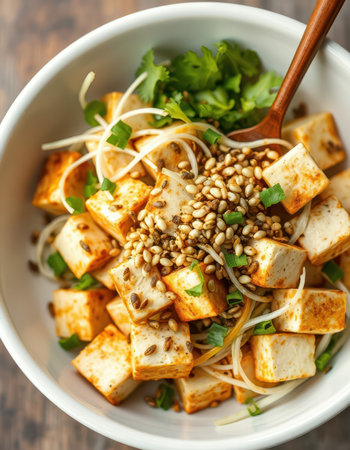 A delectable arrangement featuring crispy tofu cubes atop fresh greens, creating an appetizing and healthy meal perfect for any occasion.