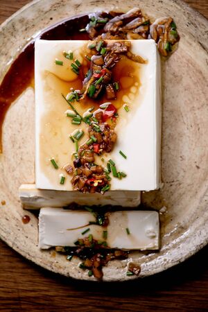 Silk tofu japanese soy cheese whole piece with chili ginger, chive and soy sauce topping on ceramic plate over wooden table. Flat lay, close up