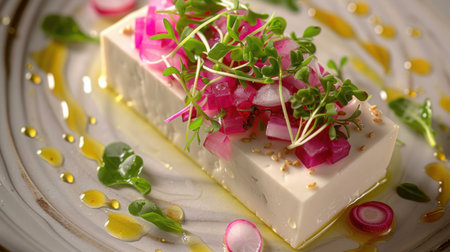 This image features an artfully presented silken tofu dish, garnished with fresh microgreens and drizzled with a soy sauce reduction, ideal for culinary inspiration.