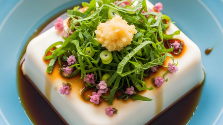 A beautifully arranged silken tofu dish drizzled with soy sauce, topped with fresh scallions and aromatic garnishes, showcasing simplicity and taste.
