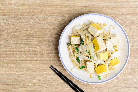 Stir fried mung bean sprouts with tofu on white plate and chopsticks on wooden background, Asian vegan food, Top view