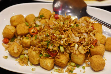 Sue fried tofu hot water with chili and onion on white plate on tablecloth