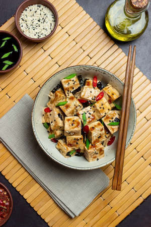 Tofu in teriyaki sauce with green onions, chili peppers and sesame. Asian food. Vegetarian food. healthy eating