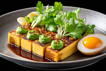 Plated pan fried tofu appetizer served with cilantro and soft boiled egg