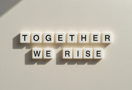 A modern and minimalistic image featuring the uplifting phrase Together We Rise created with individual letter tiles, symbolizing unity and strength in effort.