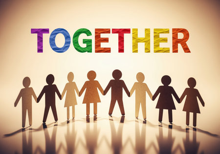 A line of diverse paper cutout figures, representing various skin tones and genders, hold hands under the colorful word TOGETHER, symbolizing unity, inclusion, and global harmony